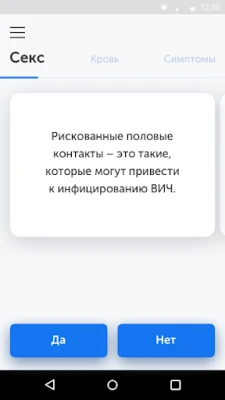 How does it work? You answer 3 groups of questions on the topic of sex, blood, symptoms. Based on your answers, the algorithm will give an answer in %, what is the probability that you could theoretically be infected with HIV. This application does not diagnose. The accuracy of the result depends on the honesty of your answers, but is not final. To get an accurate result, you need to undergo physical testing at a special point or by self-testing with a certified test for this. The application has a map that displays testing points. If you have geolocation enabled, you will see the nearest point. The application does not collect personal data. All statistics that are collected (country, gender, answer to the question) are depersonalized and in no way can reveal the persons who use the application.
